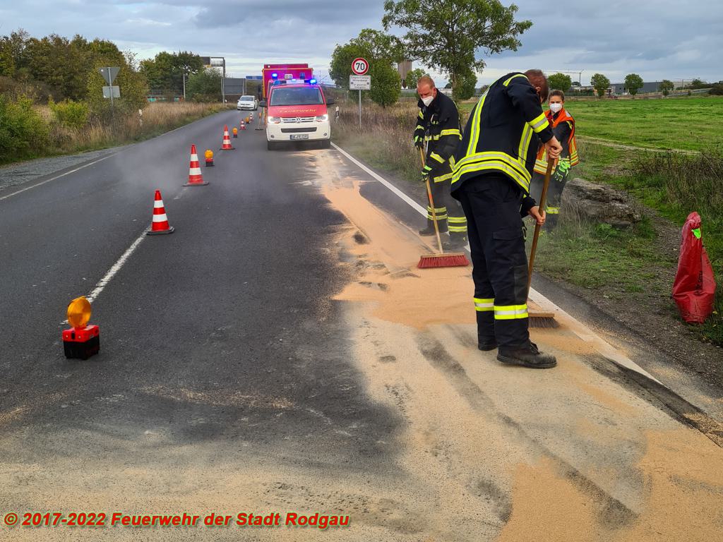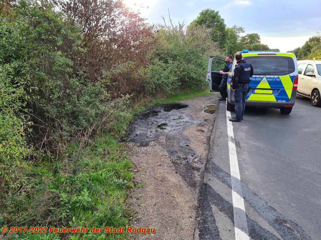 Über mehrere Meter am und neben dem Straßenrand verteilt befand sich eine größere Menge Öl. Die Feuerwehr sicherte den Bereich weiträumig ab und setzte Bindemittel ein um eine weitere Ausbreitung bzw. Einsickern des Öls zu verhindern.