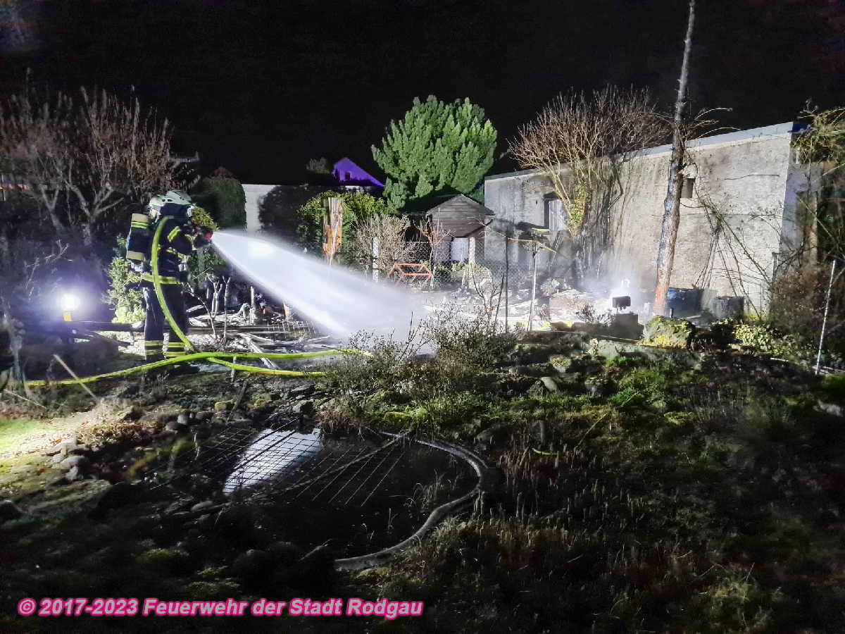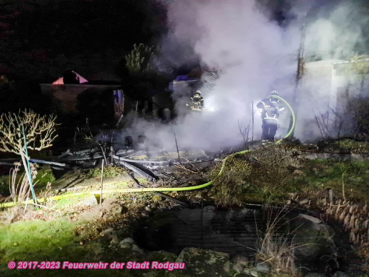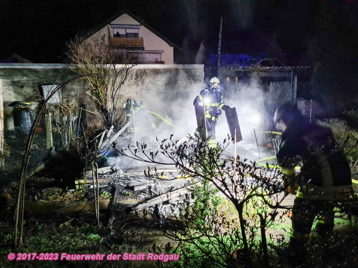 Bei Eintreffen der Feuerwehr brannte eine Gartenhütte in voller Ausdehnung. Umgehend wurde durch die Einsatzkräfte unter Atemschutz die Bekämpfung des Brandes eingeleitet.