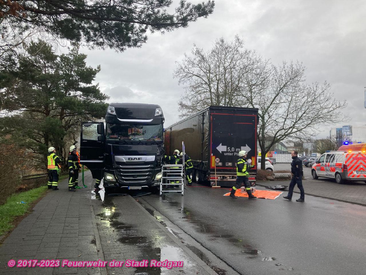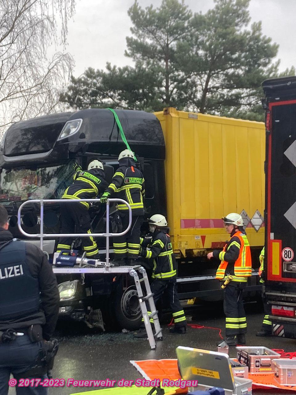Nach einem Verkehrsunfall zwischen 2 LKW wurde eine Person aus ihrem Fahrzeug unter Zuhilfenahme von Hydraulischem Rettungsgerät befreit. Weiterhin wurde unter Anderem die Einsatzstelle abgesichert und ausgelaufene Betriebsmittel abgebunden.